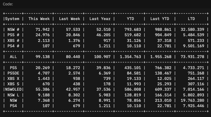 This week, the Switch got a pretty decent bump (57k to 71k) for no apparent reason. Meanwhile, the PS5 is still chugging along after its biggest release of the year in Japan came and went.