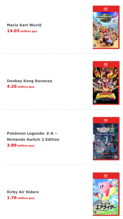 Switch 1 The Switch 1 hardware forecast hasn’t changed. Nintendo is still projecting 4 million units sold for the fiscal year, which means they’ll need to move about 750,000 units in the current quarter (January–March) to hit that target. Meanwhile, Switch 2 has already reached 17.37 million units LTD in less than seven months. For context, Nintendo originally projected 15 million units for its first fiscal year. Switch 2 has completely blown past that forecast; so much so that Nintendo raised the projection to 19 million last quarter. At this pace, a 20 million unit first year is absolutely doable. That’s pretty exciting with Nintendo having not even released it’s most heavy hitter AAA games for the console yet.