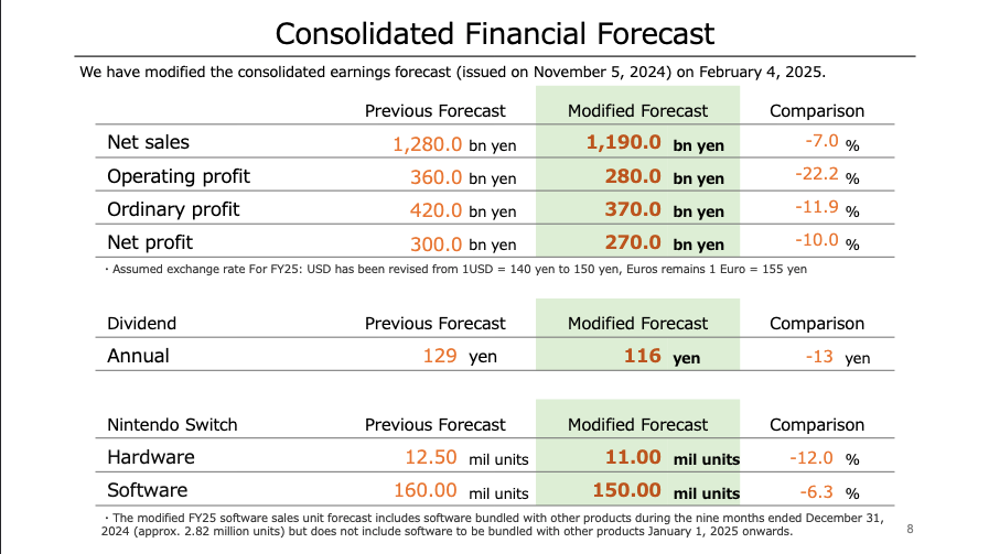 Switch hardware forecast was revised down again, this time from 12.5m to 11m. The Switch is slowing down and has at least just one more quarter to itself before Switch 2 likely releases. Software was also reduced by again this quarter by 10m units from 160m to 150m.